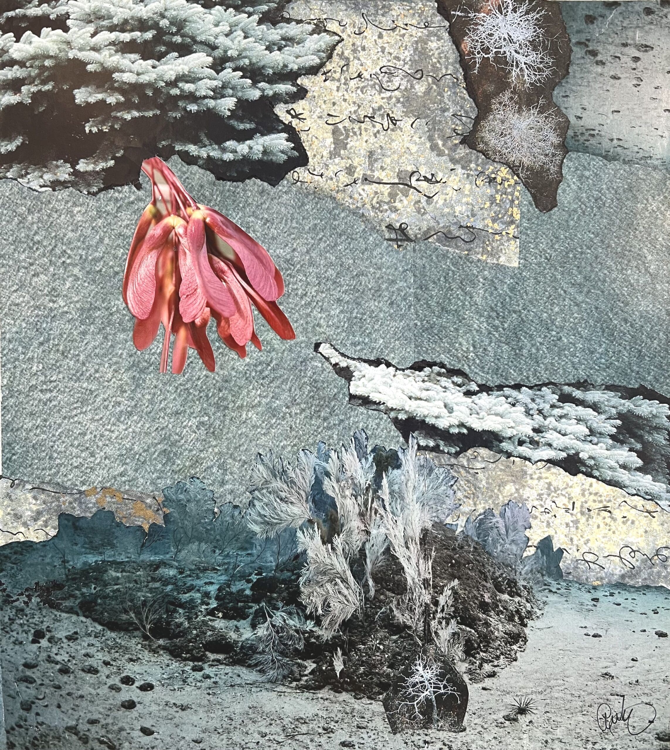 “Collage-3” collage on paper on board, grey/turquoise with red “maple seed”” accent. dark green sides Archival varnished Vertical 12x9x1 – ready to hang Print available on request (please email) for $95