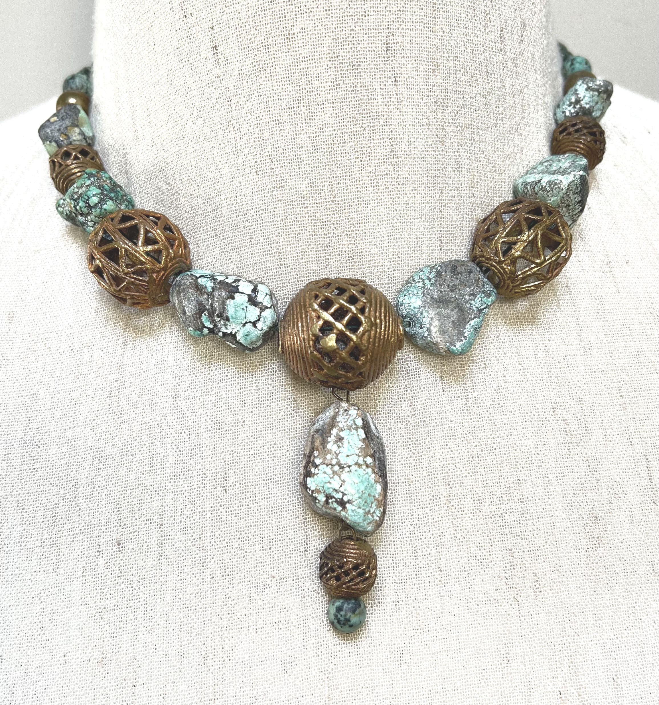 One-of-a-kind hand-knotted statement necklace with large turquoise chunks and lacy bronze beads on dark green string