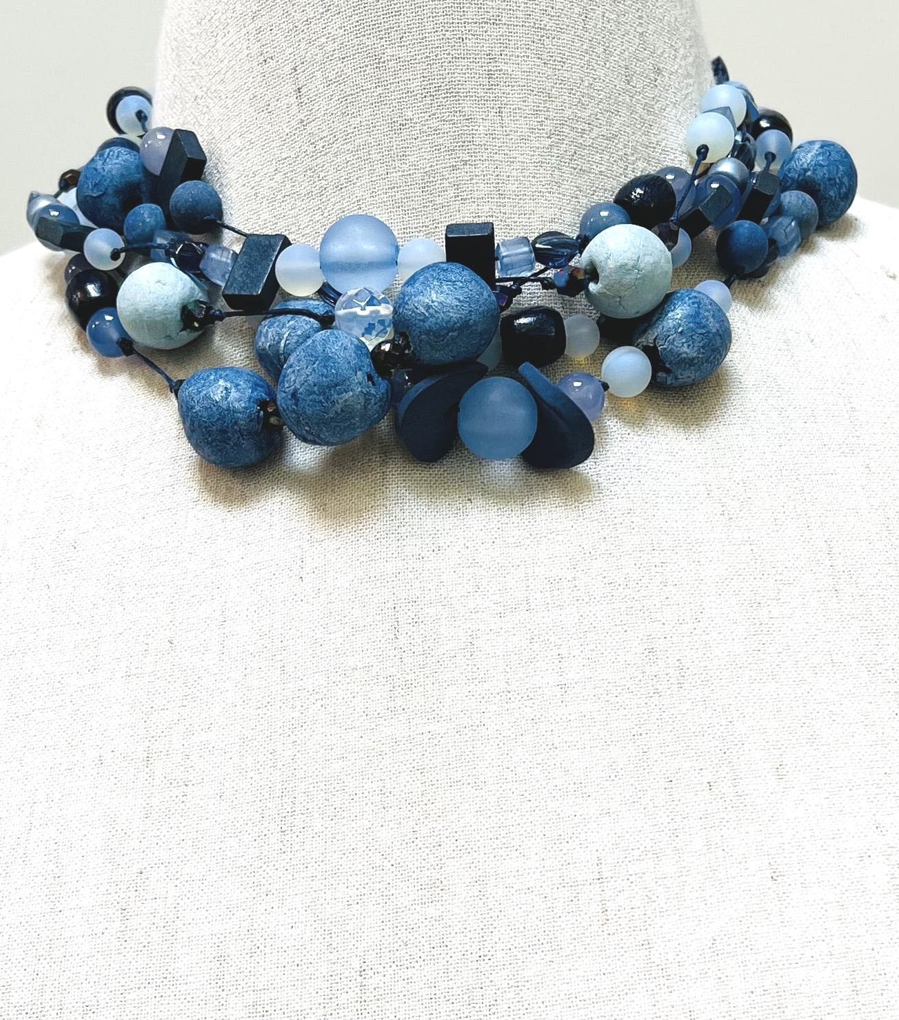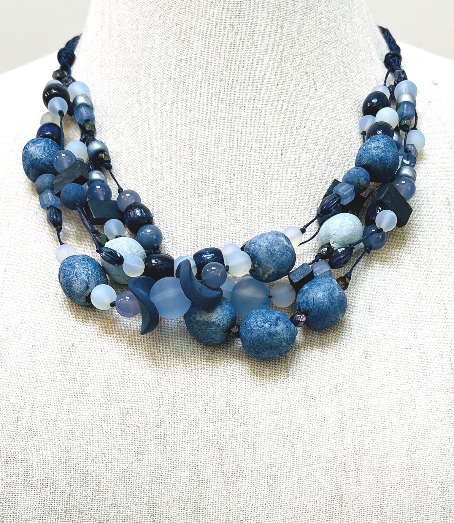 One-of-a-kind hand-knotted 5-strand statement necklace with a variety of blue handmade ceramic, stone, wood, resin and moonstone beads on navy string