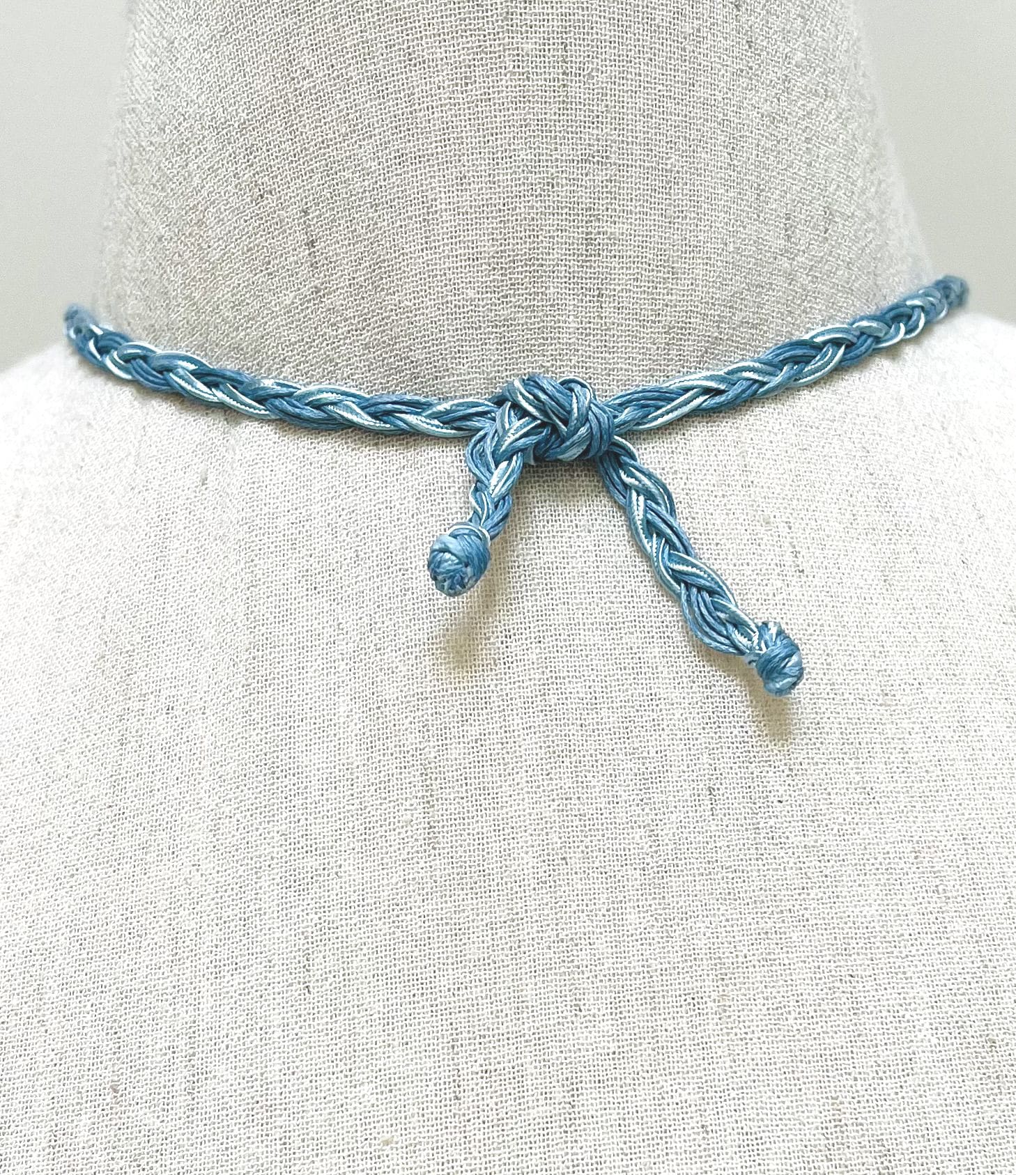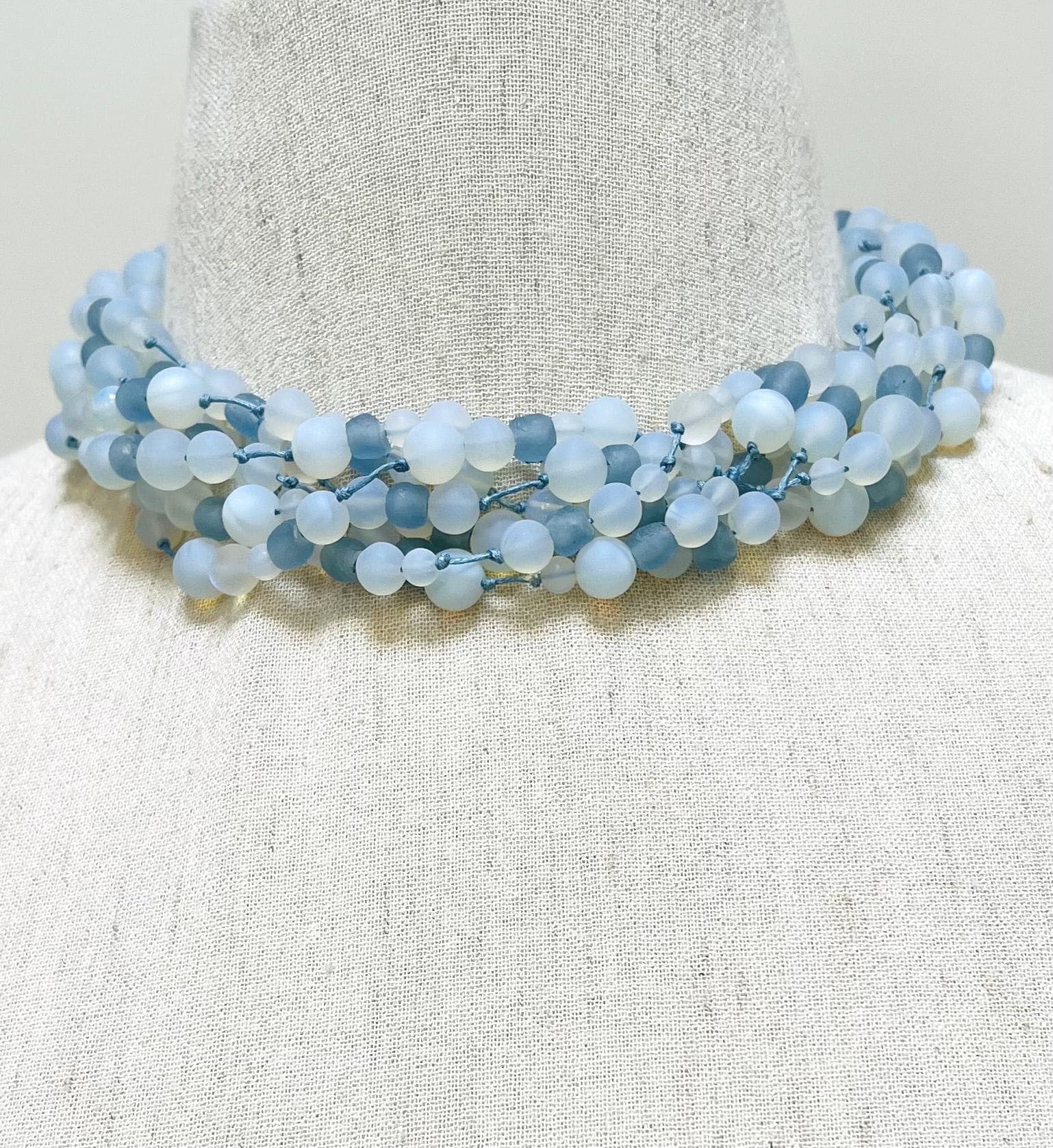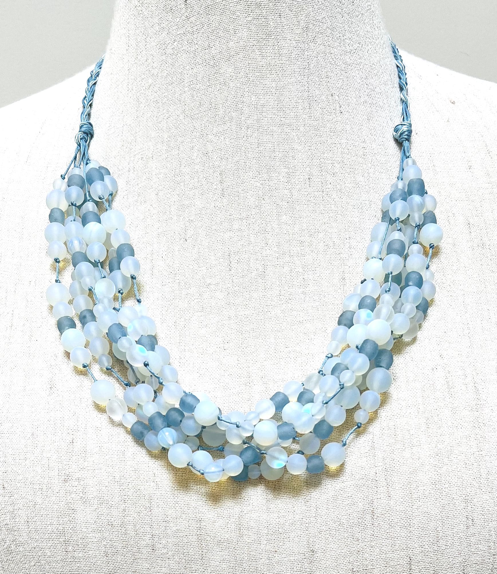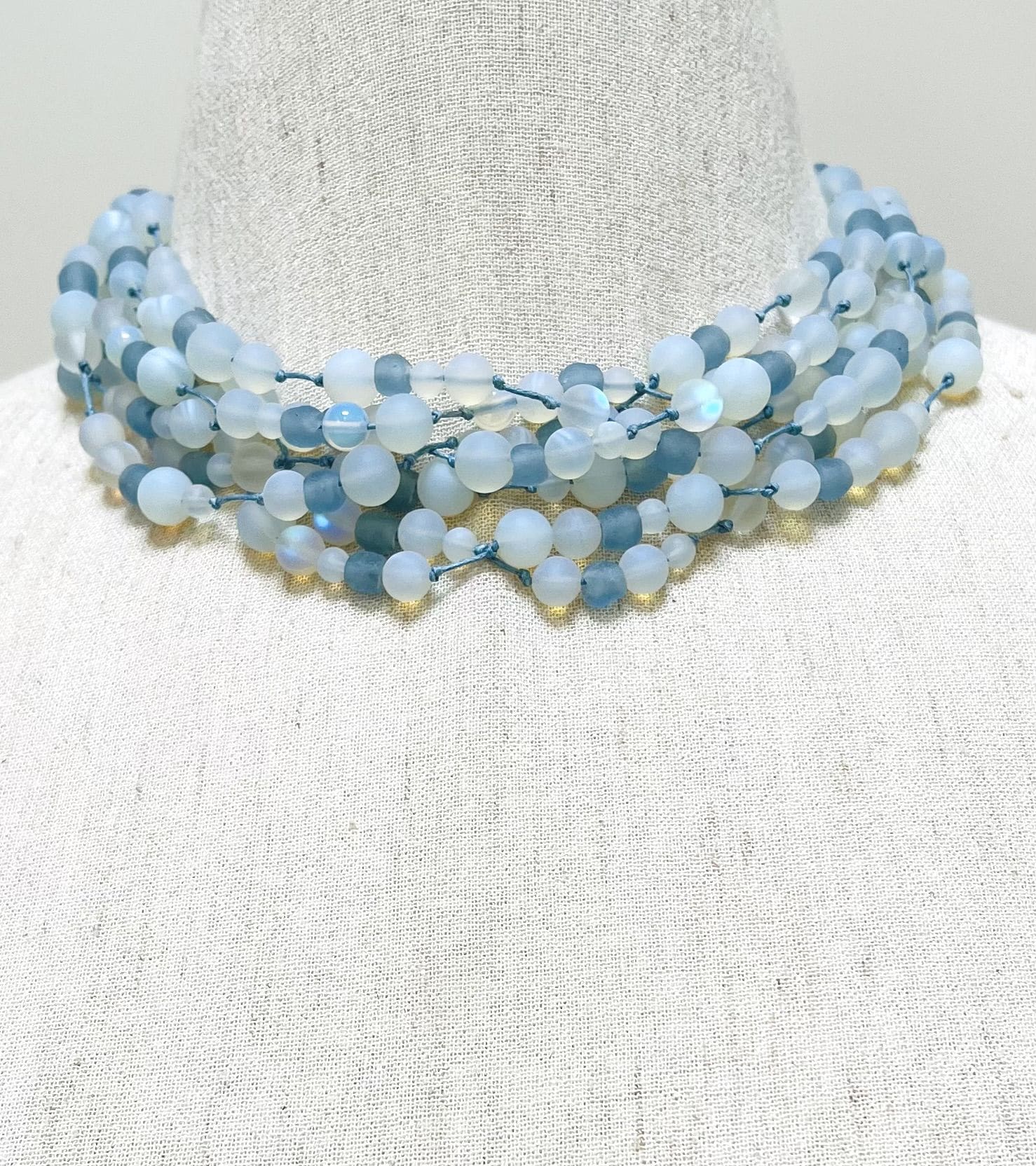 One-of-a-kind hand-knotted 7-strand necklace with a variety of opal moonstone beads on light blue string and cord Adjustable easy-tie closing, weighs 5 oz FREE SHIPPING